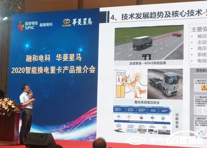 會議中,高繼東以華菱星馬首席專家的身份從電動重卡的應用場景、國內外電動重卡最新發展動態等方面指出現階段電動重卡在國內具有突出的發展優勢、電動重卡將成為今后城市減排的重要舉措。隨后高繼東對電動重卡新技術的發展趨勢進行研判,從節能技術、安全化技術、集成化技術、換電技術、智能駕駛技術等技術領域的技術難點以及發展方向進行了深度講解。