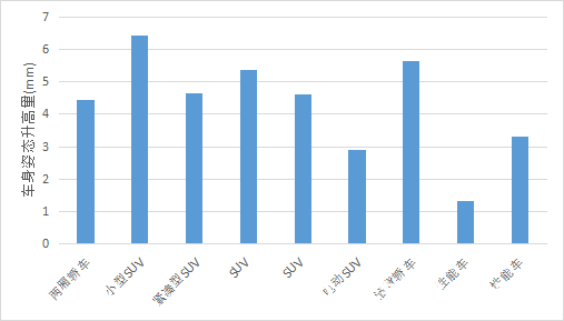 圖2 某9款車型風(fēng)洞內(nèi)實(shí)測車身姿態(tài)升高情況(模擬實(shí)際道路姿態(tài)vs固定姿態(tài))