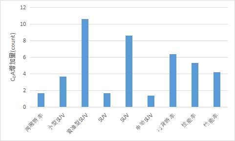 圖3 某9款車型風(fēng)洞內(nèi)實(shí)測風(fēng)阻CDA增加量(模擬實(shí)際道路姿態(tài)vs固定姿態(tài))