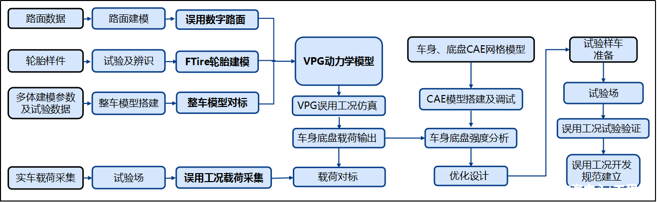 針對行業(yè)痛點(diǎn),中汽中心工程院智駕技術(shù)開發(fā)部智能車輛可靠性開發(fā)團(tuán)隊(duì)已多年深耕結(jié)構(gòu)強(qiáng)度路面沖擊誤用開發(fā)技術(shù)。該項(xiàng)技術(shù)采用虛擬試驗(yàn)場(VPG)技術(shù),通過建立整車高精度動(dòng)力學(xué)模型,結(jié)合Ftire輪胎模型、高精度誤用數(shù)字路面,利用高效算法來模擬實(shí)車運(yùn)動(dòng)過程中受到的動(dòng)態(tài)載荷沖擊,精準(zhǔn)復(fù)現(xiàn)用戶工況,確保了汽車車身、底盤等系統(tǒng)在各種誤用工況下的安全性與可靠性。如下為整車誤用開發(fā)流程說明: