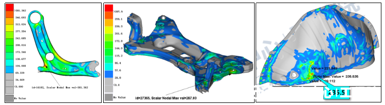 為了克服上述挑戰(zhàn),我司團(tuán)隊(duì)引入了虛擬試驗(yàn)場(VPG)技術(shù),采用VPG虛擬仿真技術(shù),模擬實(shí)車在路面上的遇到的各種路況(路障、路沿、方坑等)。該技術(shù)不僅能夠精確分析汽車在各種復(fù)雜工況下的動(dòng)態(tài)結(jié)構(gòu)響應(yīng),還能有效預(yù)測潛在的強(qiáng)度風(fēng)險(xiǎn),技術(shù)團(tuán)隊(duì)對模型在不同數(shù)字路面上進(jìn)行多輪次、多場景的仿真分析,涵蓋各種可能遇到的道路狀況、不同車速以及駕駛行為等因素。在仿真過程中,密切關(guān)注結(jié)構(gòu)應(yīng)力應(yīng)變、屈曲和殘余位移等指標(biāo)的變化,以評估結(jié)構(gòu)強(qiáng)度的安全性、可靠性及維修性,給車身及底盤等輕量化帶來合理設(shè)計(jì)邊界,在兼顧整車安全的同時(shí),更好地為汽車產(chǎn)品輕量化設(shè)計(jì)提供支撐。在開發(fā)過程中,研發(fā)人員可以根據(jù)這些預(yù)測結(jié)果,針對性地優(yōu)化車輛結(jié)構(gòu)設(shè)計(jì),增強(qiáng)車身及底盤等結(jié)構(gòu)的強(qiáng)度、屈曲及螺栓緊固件等,從而避免在實(shí)際使用中出現(xiàn)強(qiáng)度誤用問題,幫助汽車廠商避免潛在的安全隱患。有效縮減企業(yè)的研發(fā)開支,減少試驗(yàn)次數(shù)和優(yōu)化設(shè)計(jì)流程,降低企業(yè)的運(yùn)營成本,同時(shí)加快新車型的研發(fā)速度。