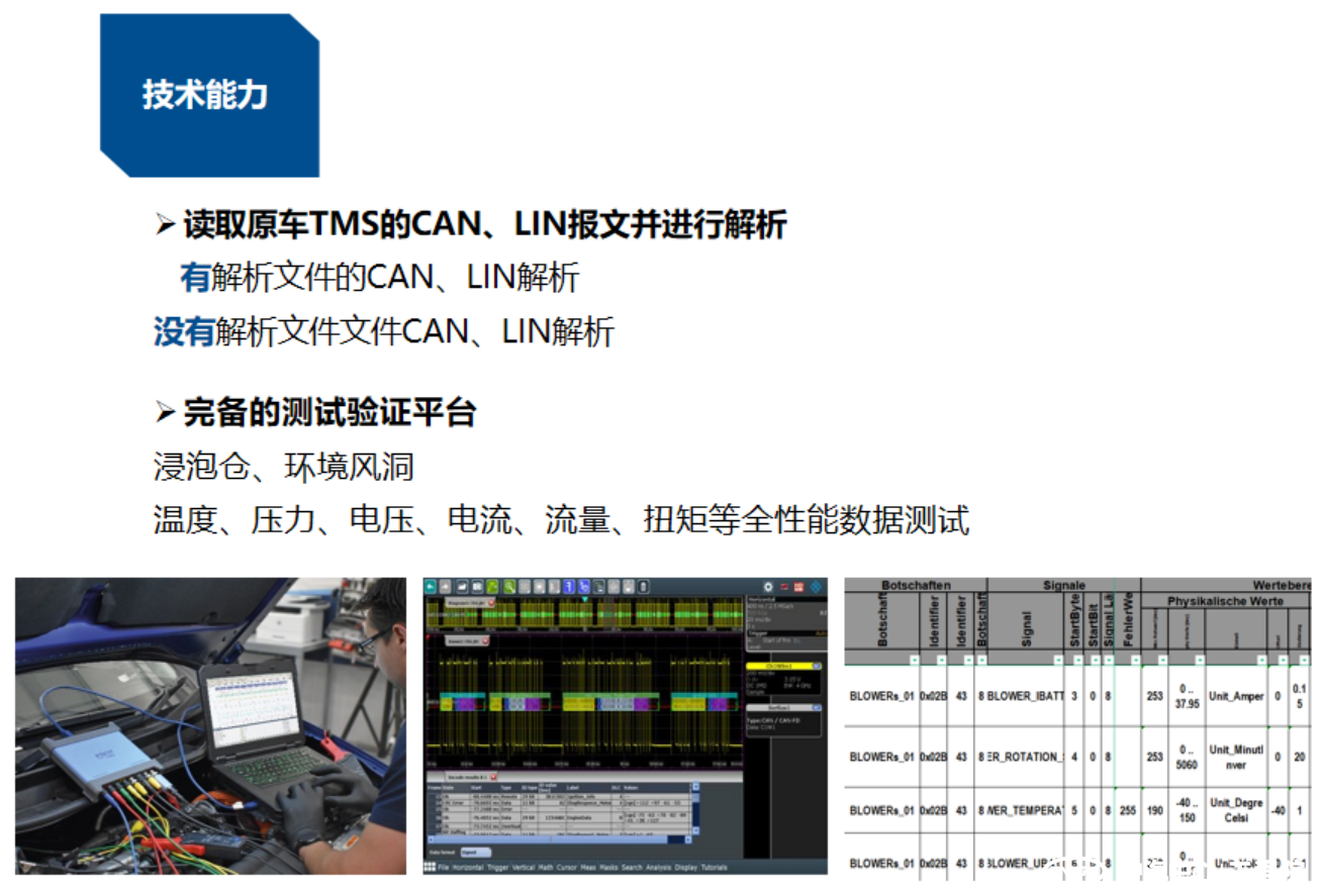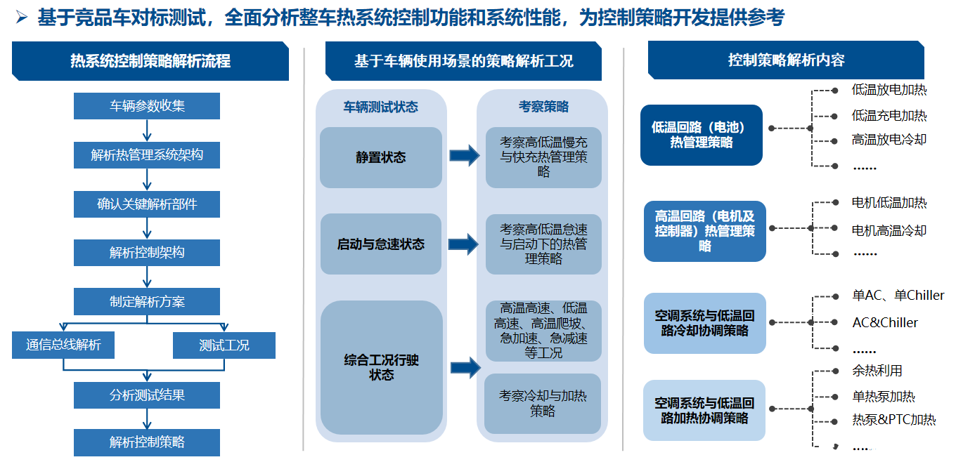 針對不同車型和熱管理架構系統,建立熱系統控制策略解析流程,定制化制定策略解析工況。目前團隊具備了對各熱系統部件控制通信的CAN、LIN解析能力,同時可讀取原車熱系統的CAN、LIN報文并進行解析的能力,通過整車布置全性能數據測試的傳感器,可實現對熱系統控制策略更為全面詳細的解析。