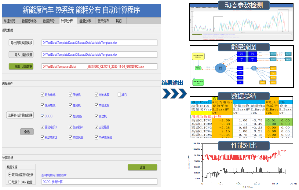 基于熱管理系統測試數據,通過數據自動化分析工具,可快速實現競品車之間熱系統性能對比,為熱系統性能和控制策略優化提供依據和方向。同時,還可清晰梳理出熱系統的能耗情況,并羅列出各部件的詳細能耗,快速鎖定高能耗關鍵部件,方便以基于降能耗為目標的控制策略優化。