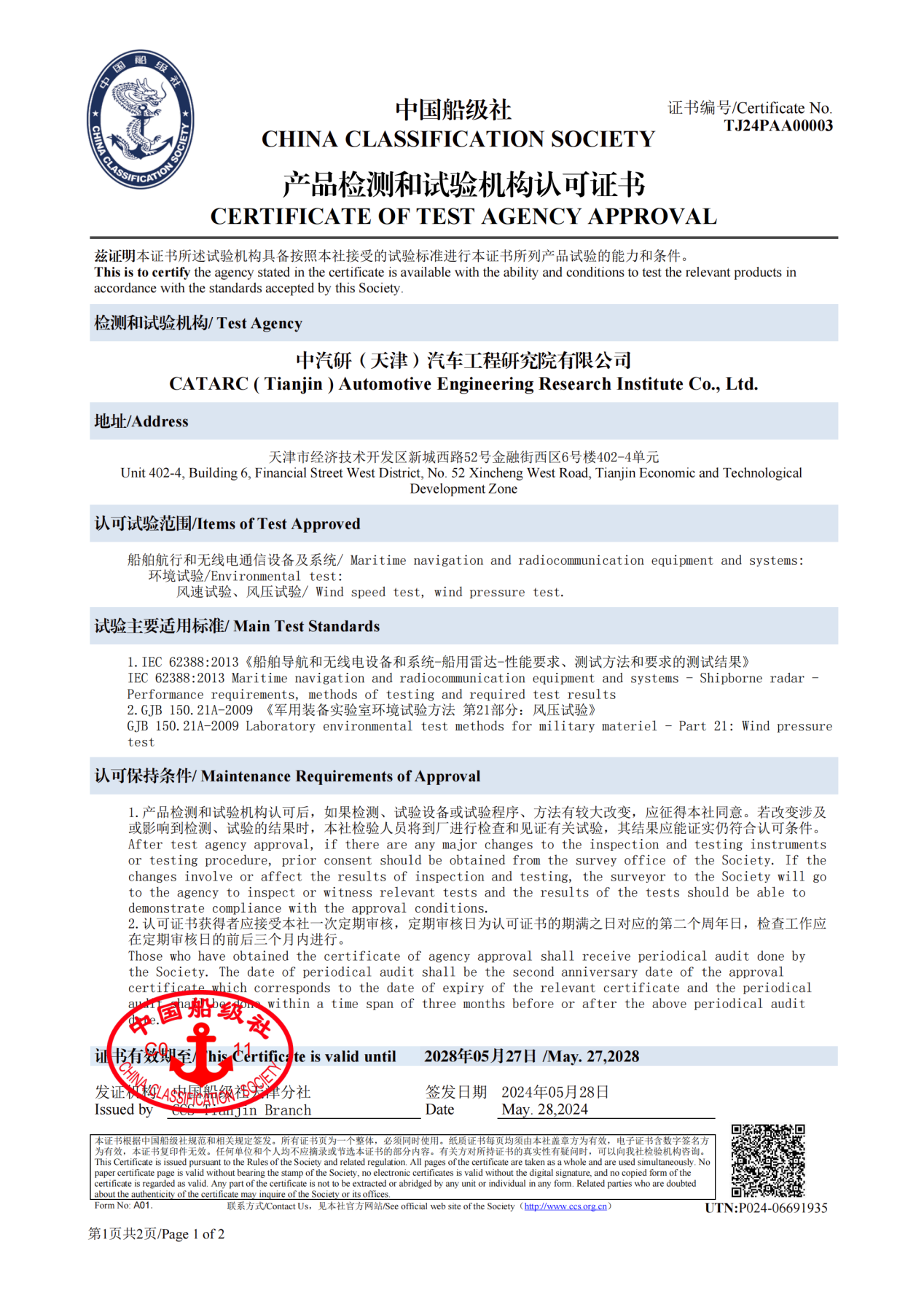 2024年5月28日,由中汽研(天津)汽車工程研究院有限公司(簡稱“中汽中心工程院”)申報的“船舶航行和無線電通信設備及系統的風速試驗、風壓試驗”認可申請正式獲得中國船級社批準,并順利獲得“產品檢測和試驗機構認可證書”。工程院正式成為擁有開展IEC 62388:2013《船舶導航和無線電設備和系統-船用雷達-性能要求、測試方法和要求的測試結果》、GJB 150.21A-2009 《軍用裝備實驗室環境試驗方法 第21部分:風壓試驗》測試的第三方檢測機構。