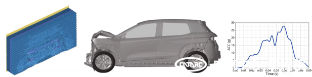 在工程實際應用中,FWDB有限元壁障可滿足車型的正面碰撞工況分析開發,性能表現穩定,可有效支持車體結構的仿真優化,在設計階段發現潛在問題,減少車型試制階段的工程試驗成本與設計變更。在某緊湊型SUV的仿真案例中,FWDB有限元壁障自身變形合理,車體前保蒙皮、防撞梁、吸能盒與縱梁等結構變形正常,整車B柱下加速度可支持后續約束系統模型分析。
