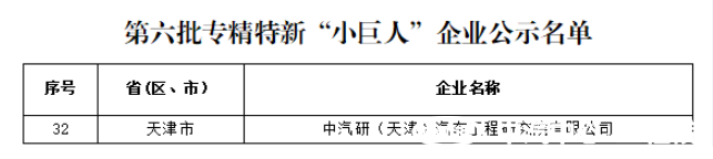 近日,根據工業和信息化部審核認定結果,天津市工業和信息化局發布了第六批專精特新“小巨人”企業公示名單,中汽研(天津)汽車工程研究院有限公司(簡稱“中汽中心工程院”)位列其中,榮獲國家級專精特新“小巨人”企業榮譽稱號。