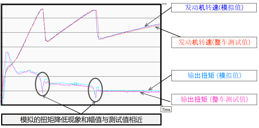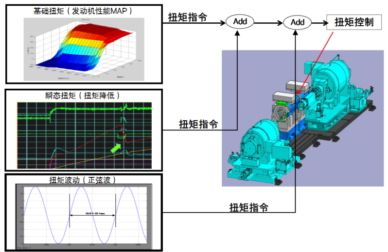 包含更精確的發(fā)動(dòng)機(jī)模型,可模擬其真實(shí)扭矩信號(hào),包含從性能MAP中提取的基礎(chǔ)扭矩、整車道路工況變化時(shí)的瞬態(tài)扭矩和發(fā)動(dòng)機(jī)燃燒產(chǎn)生的扭矩正弦波動(dòng)。經(jīng)過測(cè)試驗(yàn)證,發(fā)動(dòng)機(jī)扭矩的模擬值和整車環(huán)境的測(cè)試值具有高度一致性。
