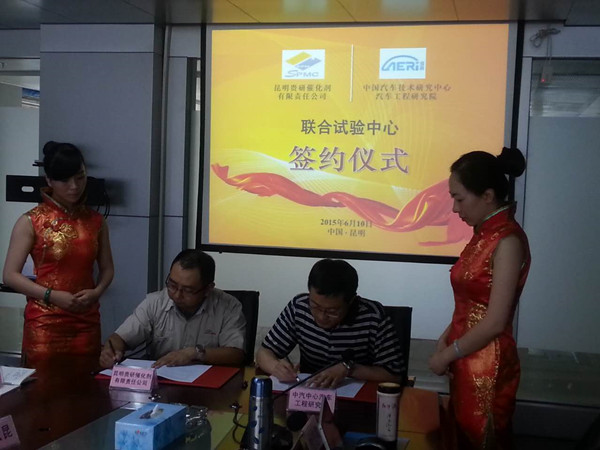 2015年6月10日,昆明貴研催化劑有限責(zé)任公司(以下簡稱“昆貴研公司”)與中國汽車技術(shù)研究中心汽車工程研究院(以下簡稱“中汽中心工程院”)成立“聯(lián)合試驗中心”揭牌儀式在昆貴研公司舉行。參加此次儀式領(lǐng)導(dǎo)有昆貴研公司盧軍董事長、魏軍副總經(jīng)理、賈庭渝副總經(jīng)理、賀小昆副總經(jīng)理和各部門負(fù)責(zé)人以及中汽中心工程院高繼東院長、劉雙喜主任、胡濟民主任。揭牌儀式由昆貴研公司馮豐副總經(jīng)理主持。