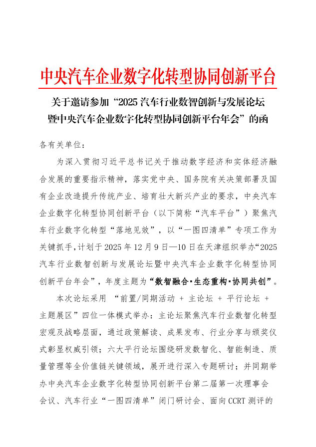 “2025汽車行業(yè)數智創(chuàng)新與發(fā)展論壇暨中央汽車企業(yè)數字化轉型協同創(chuàng)新平臺年會” 會議通知
