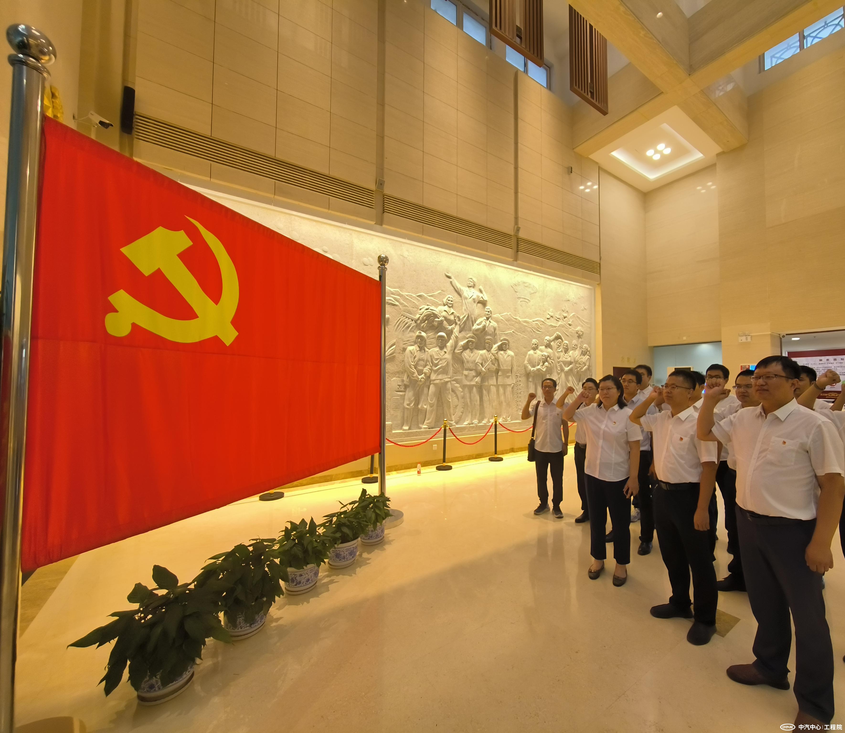 全體人員在周恩來、鄧穎超的漢白玉雕像《情滿江山》前與黨旗合影,一面旗幟,一種信仰,用最美的合影向黨表白。